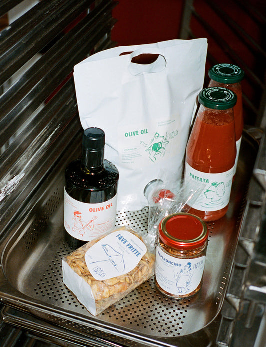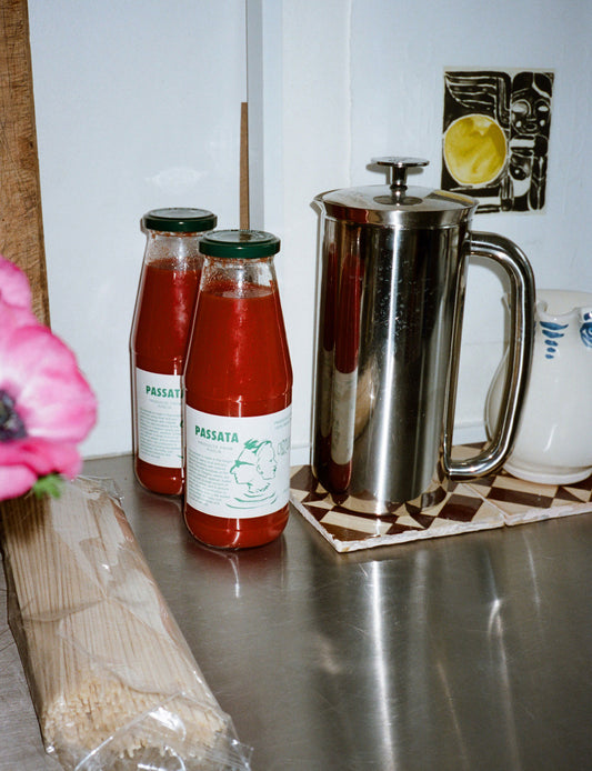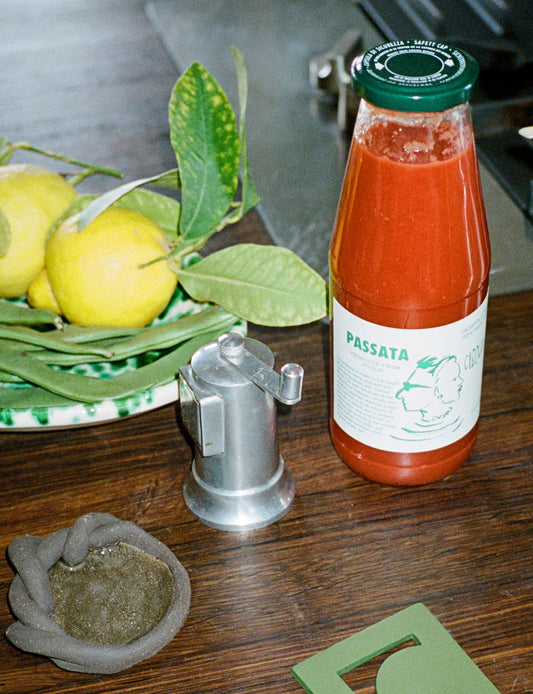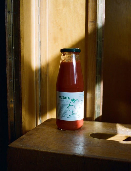 Tomato passata is made in the height of summer using exclusively local and sun-ripened tomatoes with intense flavor. The best tomatoes of the Datterino or Ciliegino variety are carefully selected. After washing, the tomatoes are boiled and mashed. A small amount of sea salt is added, and to ensure preservation, the production is pasteurized by boiling the sealed glass bottles.Sold out -